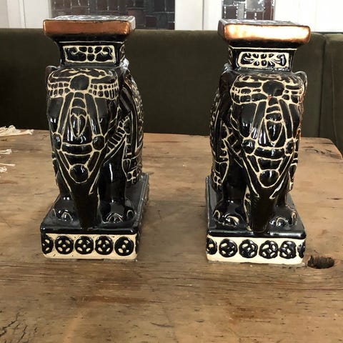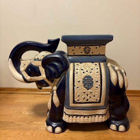 Keramisk elefantbord i blått og hvitt med dekorative mønstre. Elefanten fungerer som bordstativ med et firkantet bord på toppen. Passer som dekorativt møbel eller plantebord.