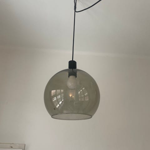 Lampeskjermen er i røkfarget glass med sort takfeste. Gir et fint uttrykk både med dekorativ pære og vanlig lyspære.