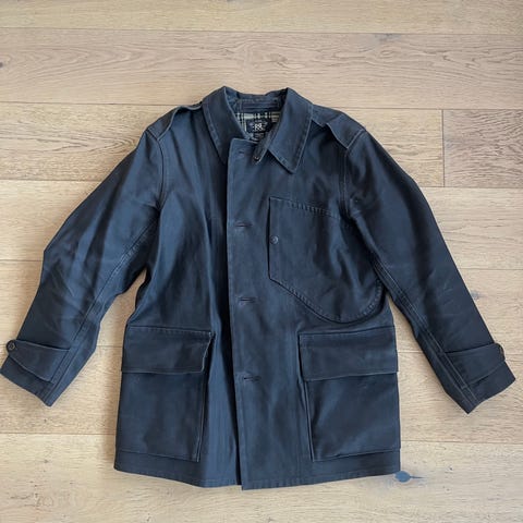 Det mangler en knapp på det ene ermet. Nederste lærrem har løsnet - kan enkelt syes på.