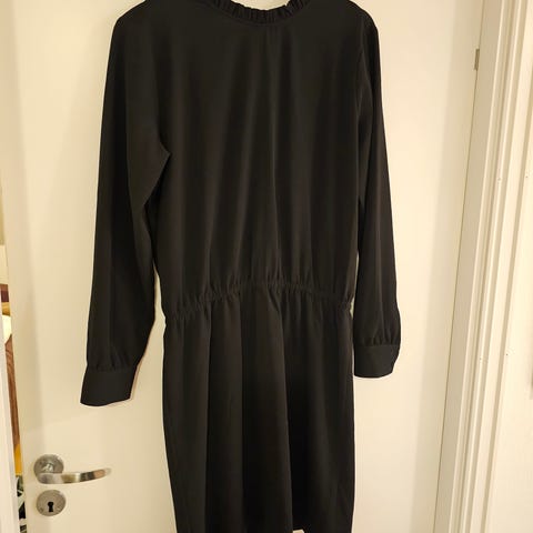 Enkel sort kjole med fine detaljer i str M. Ermer som slutter ved skuldrene, strikk i hoftehøyde, skjulte lommer på begge sider. Har hengt ubrukt i skapet og venter på å bli brukt. Allsidig kjole som kan pyntes ned eller opp.