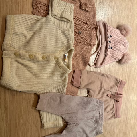 Plaggene er laget for babyer og har ulike teksturer og design, inkludert ribbestrikk og mønstrede detaljer.