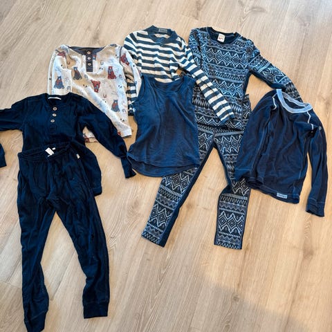 Ullklær str 110/116. Det gule settet er i str 122/128. Rift på armene ene genser og knær ene bukse. Ingen hull. Se bilder