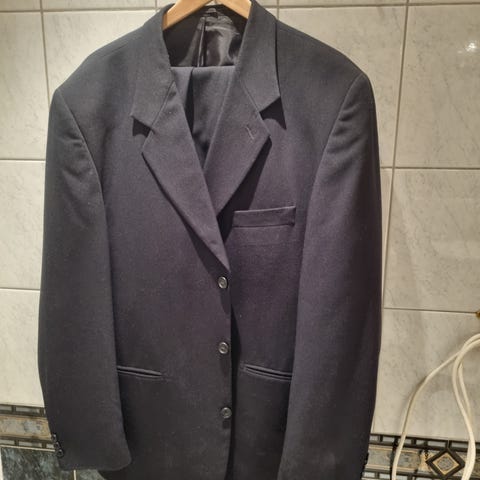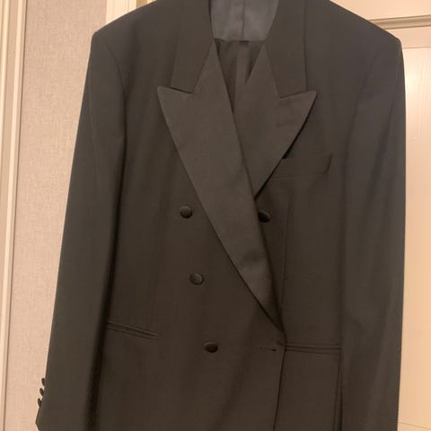 Svart smoking dress av merket Suveren, dressen har hengt i skap i flere år, og har før vært meget lite brukt. Jakken virker litt trangere enn XL, kjennes mer som en Large.