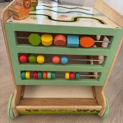EduFun aktivitetsgåvogn i tre med flere lekefunksjoner. Vognen har hjul for enkel bevegelse og inkluderer klosser i ulike former og farger for lek og læring. Egnet for små barn som lærer å gå og utvikle motoriske ferdigheter.