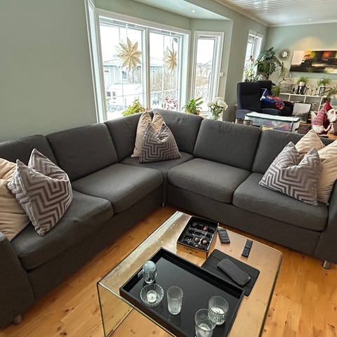 Brukt, men i god stand sofa med sjeselong. 285 cm bred og sjeselongen er 160 cm lang