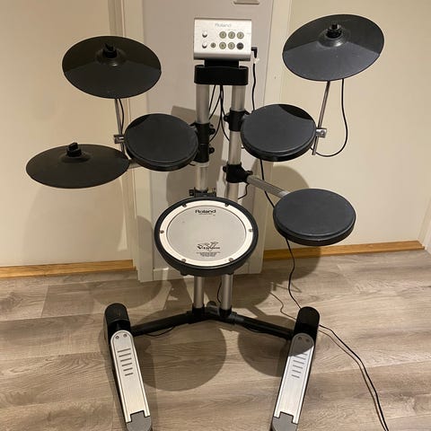 Inkluderer: stol, hodetelefoner, trommestikker, teppe og singelpedal.
