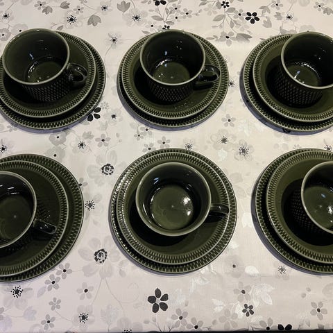 6 kopper med tilhørende skåler i flott stand selges for kr 250,- per kopp og skål.
