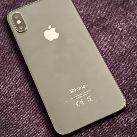 Apple iPhone X mobiltelefon med 64 GB lagringskapasitet. Telefonen har en skjerm med god oppløsning og et kamera på baksiden.Ingen riper. Batterikapasitet: 79%.