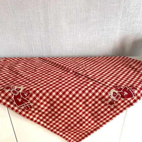 Rød juleduk:L 240cm, B 112cm. 50kr.