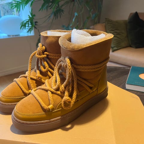 Øvre del i skinn og mykt semsket skinn. Varm foret i saueskinnspels