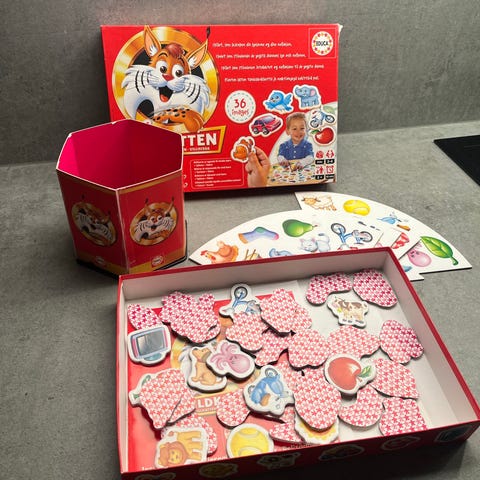 Vildkatten Animals brettspill inneholder 180 brikker med bilder av ulike dyr. Spillet leveres med kort og spilleregler, og er egnet for barn og familier som ønsker å lære om dyr gjennom lek.