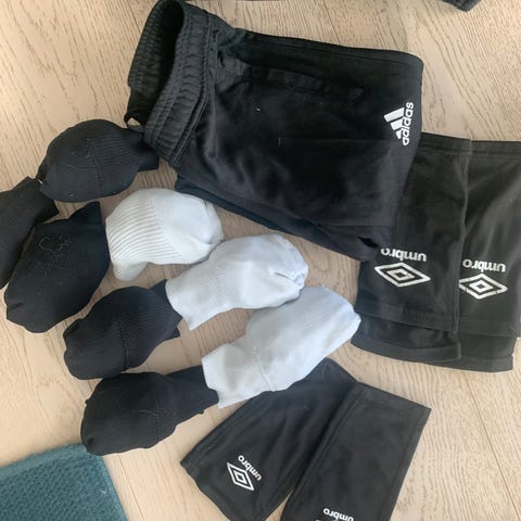 Fotball sko, knebeskyttere, fotballtrøye og sokker