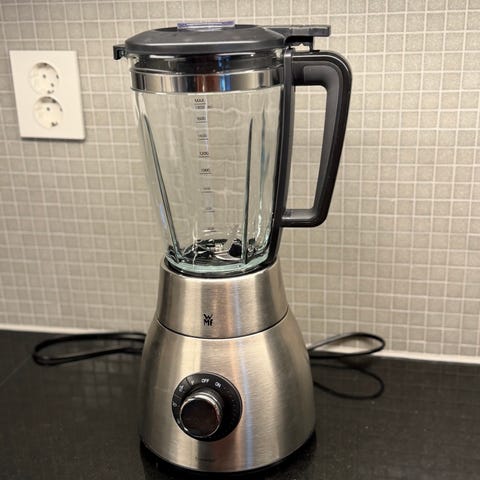 Jeg selger en WMF Kult Pro blender med rustfritt stål base og glasskanne. Blenderen har en rekke funksjoner:
