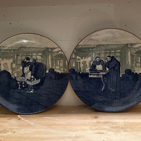 To dekorative veggplater i keramikk med antikk gresk motiv. Laget av en kunstner i Athen, kjøpt på 1950-tallet. Platene er cirka 30cm i diameter, og har veggoppheng på baksiden. Kan også brukes som fat.