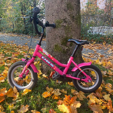 Disney Frost barnesykkel med 12 tommers hjul, hvit og blå farge, utstyrt med støttehjul. Egnet for barn som lærer å sykle.