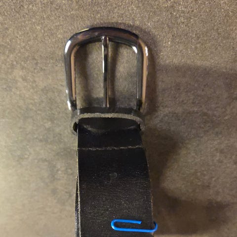 Herre belte laget av svart og brunt lær med en sølvfarget spenne. Beltet har flere hull for justering og en klassisk design som passer til ulike antrekk. Kan brukes begge veier. Selger da sønnen har vokst og måtte kjøpe nytt til dressen.