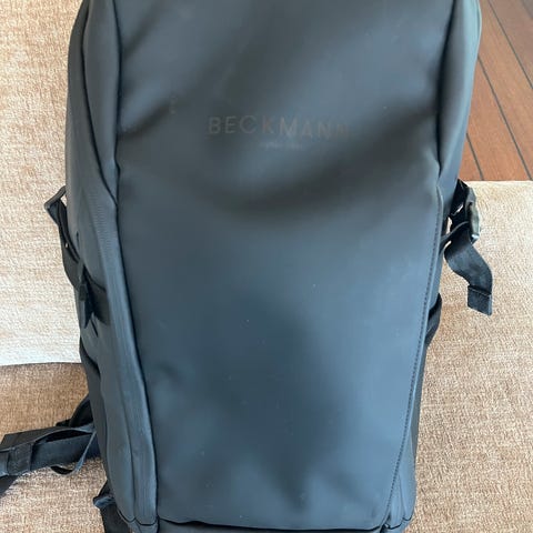 Selger denne meget pent brukte Rains ryggsekk i kunstlær, pvc. Unisex modell. Ryggsekken har en enkel og funksjonell design med to justerbare skulderstropper og klaff med spenner foran. Materialet gir et vannavstøtende lag, egnet for daglig bruk og ulike værforhold. Egen lomme for laptop. Se produktinformasjon på et av bildene med målene. Nypris på Zalano ligger på 800kr. Selges for 250kr pluss porto.