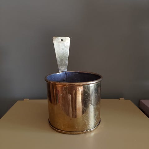 Med hengende "ører" på sidene. Høyde 9 cm, måler ca 14x17,5 pluss ører. Bruksspor i hovedsak innvendig, ellers pen for alderen.