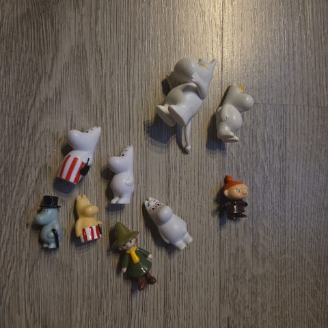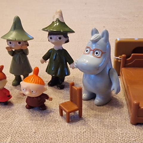 Moomin Wooden Figurines er et sett med mummitrefigurer. Settet inkluderer fem figuriner i tre, esken inni er dekorert. Esken har blitt åpnet og lagret, men ellers ubrukt. Ikke for barn under 3 år. Eskens mål: 23 x 8 x 5 cm.