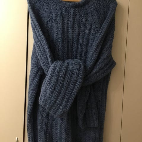 Genser i blå farge laget av ull. Passer for dame og har størrelse M/ L. Kommer ann på hvor vid en ønsker at genseren skal være . Hel lengde på 65 cm.