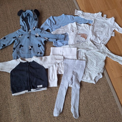 Klespakke med strømpebukser. Den kremfarget er ull. Alle er strl 50/56. Står 62 på den i ull, men er like lang som de andre. Noe nupper.