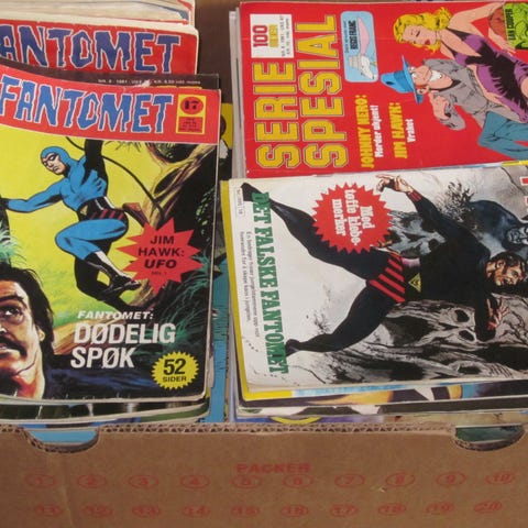 En god del tegneserier fra min barndom/ungdom selges billig. Fine blader, noen litt slitt og andre er flotte. Bildene viser et gjennomsnitt av kvaliteten. Disse har blitt lest både en og to ganger opp gjennom årene. Det er vel best at de blir hentet da dette blir ganske så tungt. Hvis kjøper vil at det skal sendes må vedkommende betale frakt.