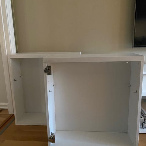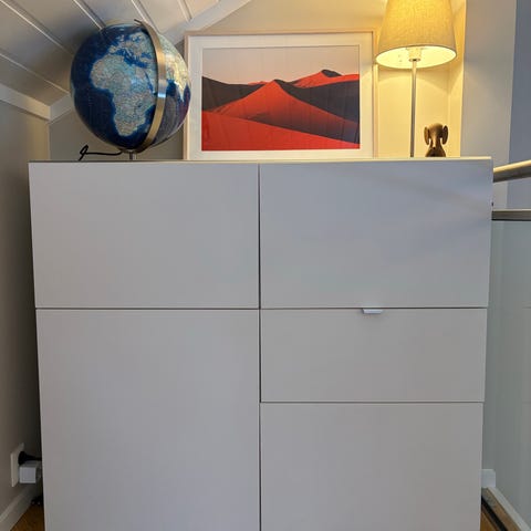 IKEA BESTÅ kommoder i lys eik og lys grågrønn. 3 stk, 1 stor som i dag brukes som nattbord, men har tidligere vært en del av tv-benk. 2 lavere deler som tidligere har vært festet på vegg over tv, men har blitt brukt til oppbevaring den siste tiden. Alle 3 har en hylle inni som er avtakbar. Push funksjon på alle.