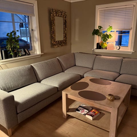 Buet hjørnesofa med to recliner på hver ende, fargen er grå tekstil. Desverre noen løse tråder og ett rift. Har mørke brune trekk jeg tror passer som er helt nye som følger med.