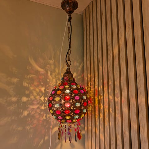 Lampens glass er i svært god stand. Det finnes et lite hakk i glasskanten øverst, men dette er nesten usynlig når lampen henger og påvirker verken funksjon eller utseende i bruk.