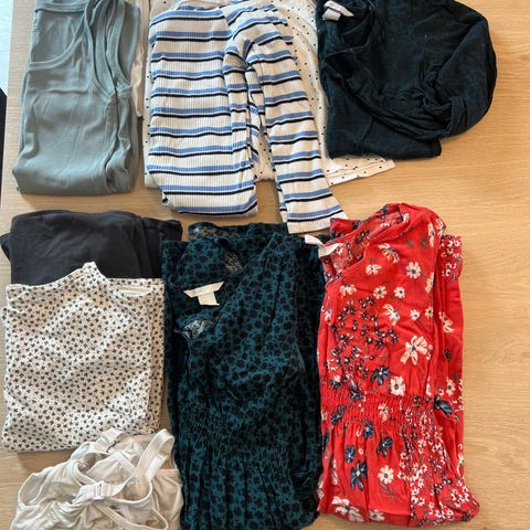 Klespakke med gravidklær / mammaklær selges samlet. Det meste er størrelse S men det er noen plagg som er XS of M. Se bildene for størrelse og tilstand.