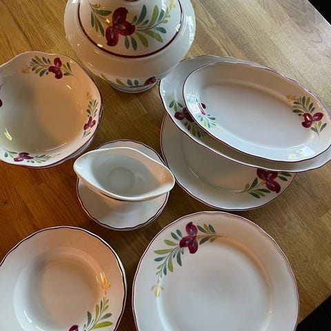 Pent servise fra Porsgrund "Marbella". Framstår som nytt ingen slitasje eller merker, bortsett fra kant på det ene kruset som nok er en produksjonsfeil( se bilde)