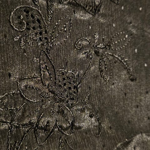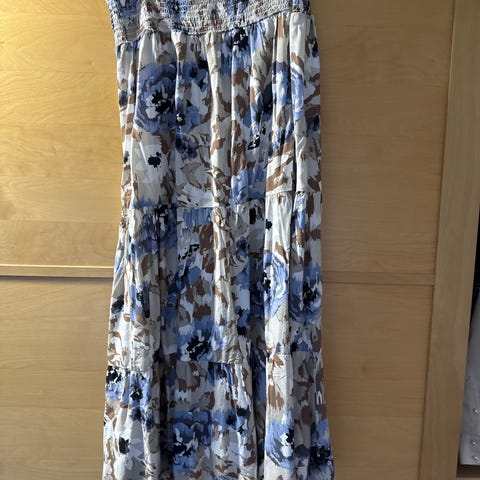 Skjortekjole størrelse passer som en romslig 40. Men det står 36. Som er litt rart. laget av polyester, men ser og føles litt som thaisilke.