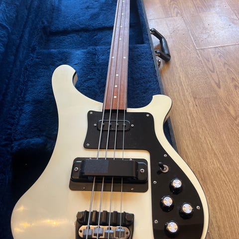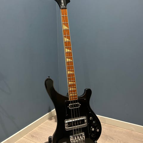 Rickenbacker 4001 stereo bassgitar med Fireglo Finish. Det er en 1975 modell. Jeg kjøpte den brukt, på Frikk Musikk i Bergen i 1981 og har hatt den siden. Litt småfiks på gitarkassen.