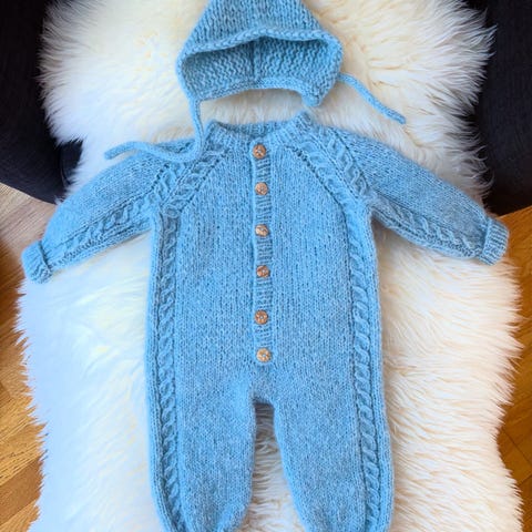 Rød hjemmestrikket lue kan medfølge.