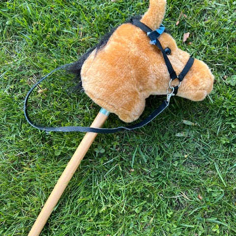 Jeg selger et svart hodelag med bitt og fluffy nesereim. Hodelaget er kjøpt til kjepphestene fra Hööks, men burde nok passe til andre kjepphester også.