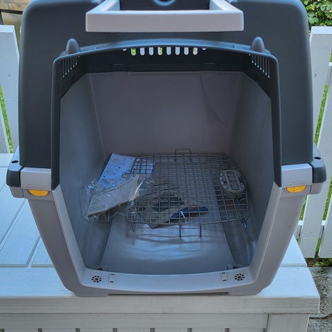 Hundebur laget i plast med metallgitterdør for mellomstor hund. Buret har ventilasjonsåpninger på sidene, håndtak på toppen og hjul for bæring/trilling. Passer til transport og oppbevaring av hunder. Vann/ matskåler på døren
