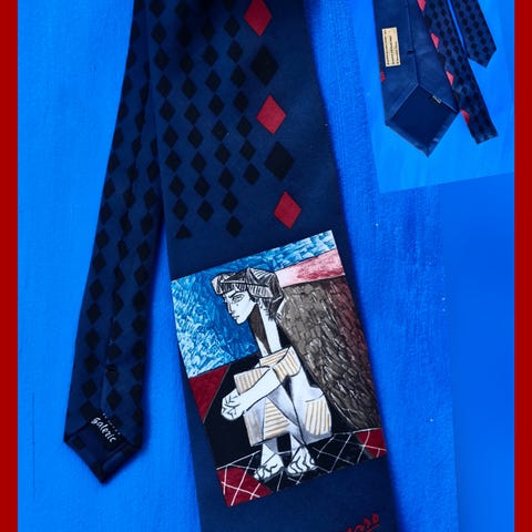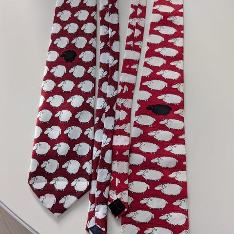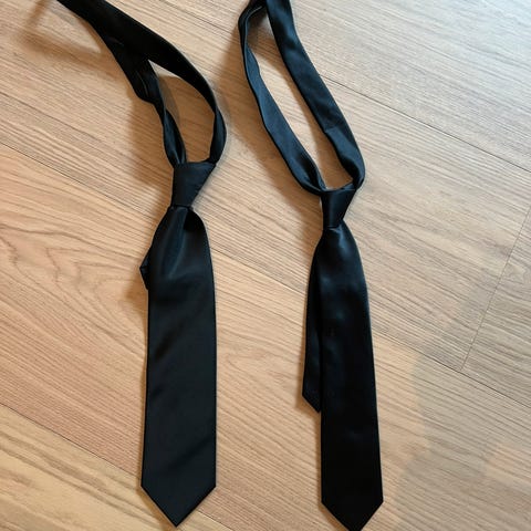 To slips selges. Det mørke slipset er lilla. 50 kroner per stykk eller 75 for begge.