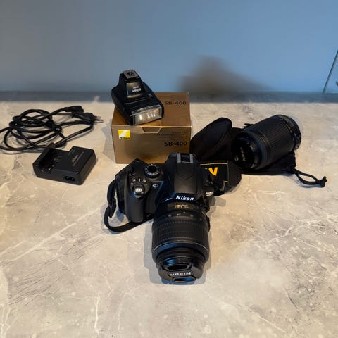 Nikon DSLR-kamera med innebygd skjerm og zoomobjektiv. Kameraet har manuelle innstillinger og ulike moduser for fotografering. Objektivet har zoomfunksjon som dekker flere brennvidder.