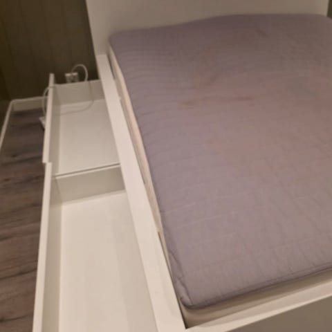 Plass til to madrasser (90 cm bredde, totalt 180 cm). Madrasser følger ikke med. Skinnputer følger med hvis ønsket (200 kroner per stykk). Overmadrass følger med, hvis ønsket (alle prisene kan diskuteres).
