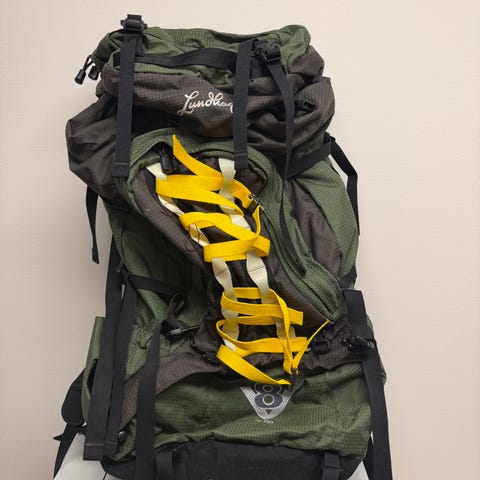 Lundhags V8 tursekk i fargene rød og svart. Sekken har flere lommer og justerbare stropper, egnet for friluftsliv og turbruk. Basis volum på 70 liter, mer om sidelommer brukes. Svært lite brukt.