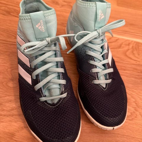 Adidas fotballsko i størrelse 38. Designet for fotball med knotter for godt grep på banen. Fargen er hovedsakelig hvit med blå og røde detaljer. Skoene er laget i materialer som egner seg for bruk på fotballbanen.