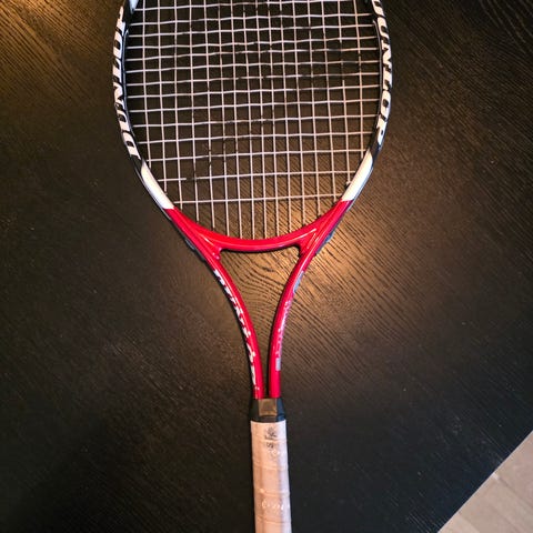 Dunlop Maxply Fort tennis racket med rød overflate og trehåndtak. Racketen er produsert i England. Kommer med original cover