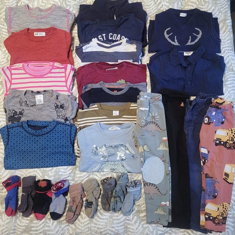 Det meste er 98/104. Noen få ting i rene størrelser: 98 og 104.