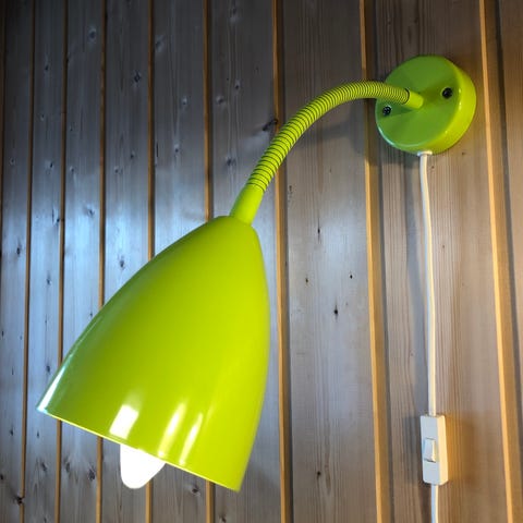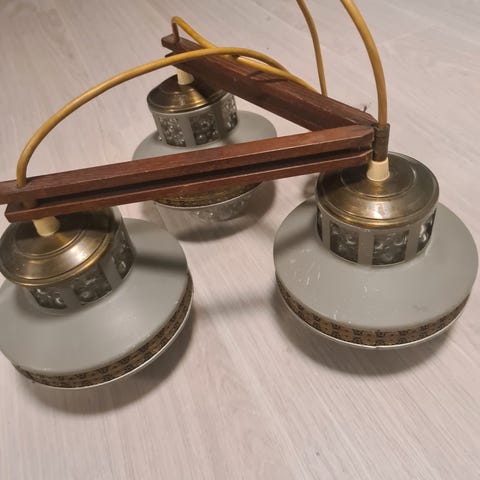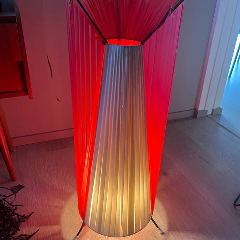 Tivolilampe 48 cm høy og 26 cm i diameter på toppen. Kan stå på gulv eller på bord. Helt nye bånd i fargene svart, gult, grønt og rosa. Den har ikke bryter på seg, men ny stikkontakt. Selges kr 1100