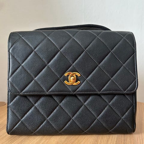 Chanel Kelly Quilted Caviar vintage 1996 med gull CC lock, dustbag og autentiserings bevis. Vesken ser helt ny ut på utsiden, beskrevet som "excellent condition". Lite bruksmerke på flap innvendig.