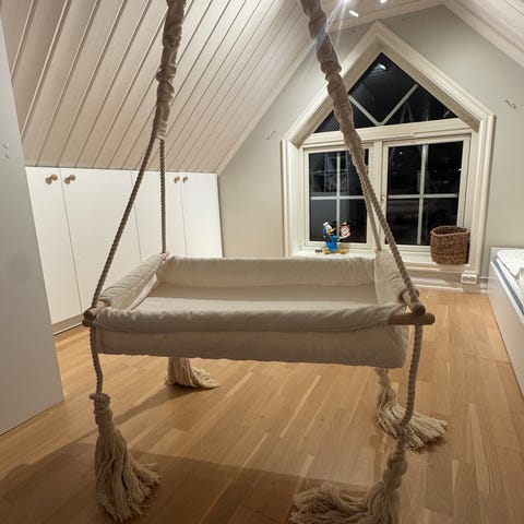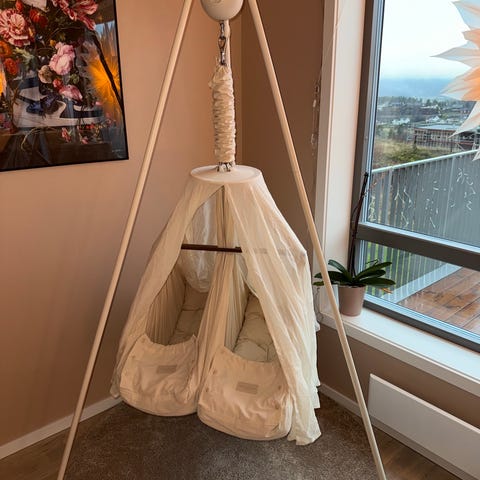 Hengevuggen er brukt en kort periode av våre tvillinger fra august-november. Det er ingen synlige flekker, og selve hengevuggen kan vaskes i maskin.