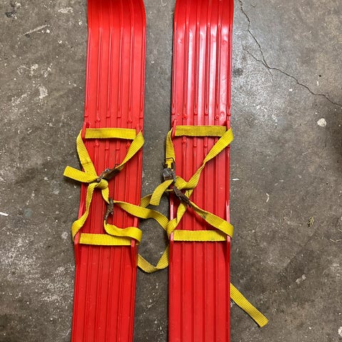 Røde miniski fra 1970-tallet til salgs. Stroppene til å feste til skoene er litt preget av rust etter tidens tann. Men disse kan fint byttes. Ellers er skiene pent brukt.