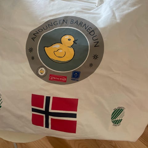 Babydyne i dun størrelse 65x80, med 4 sengesett selges samlet. Alt er helt og pent uten noen hull eller flekker.