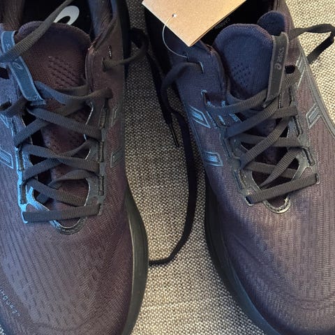 Mizuno løpesko i størrelse 46. Skoene er svarte og designet for løping. Materialet og konstruksjonen er tilpasset for sportstypen løping.