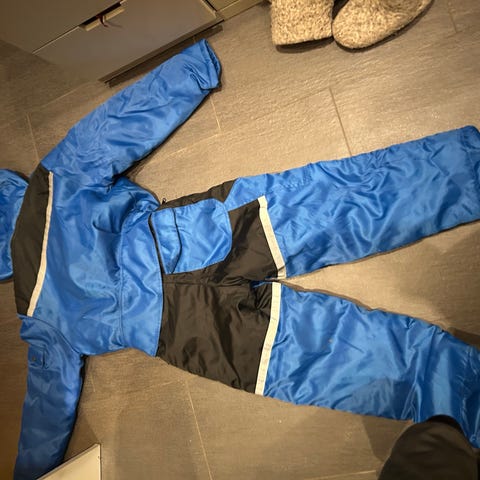 Varmedress kjøpt brukt, men dessverre for liten for meg. Dressen er godt foret og har avtagbar hette. Praktiske lommer samt glidelås fra livet og ned.